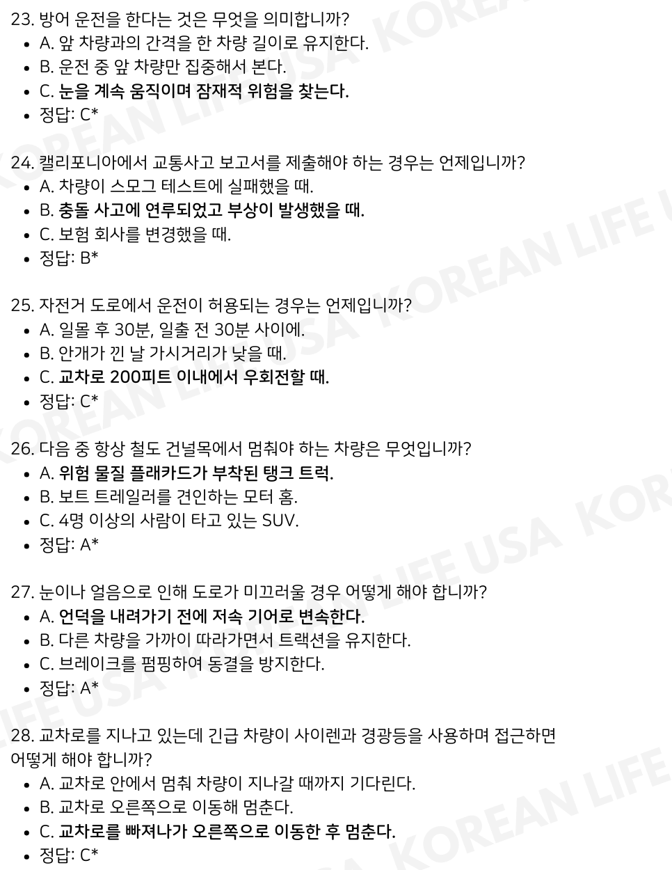 드디어 마지막 파트입니다! 여기까지 오신 여러분, 정말 수고 많으셨습니다. 이번 파트는 시험 직전에 꼭 확인해야 할 중요한 문제를 중심으로 구성했습니다. 이 모든 내용을 다 숙지하신다면, DMV 필기시험에서 무조건 합격하실 겁니다.