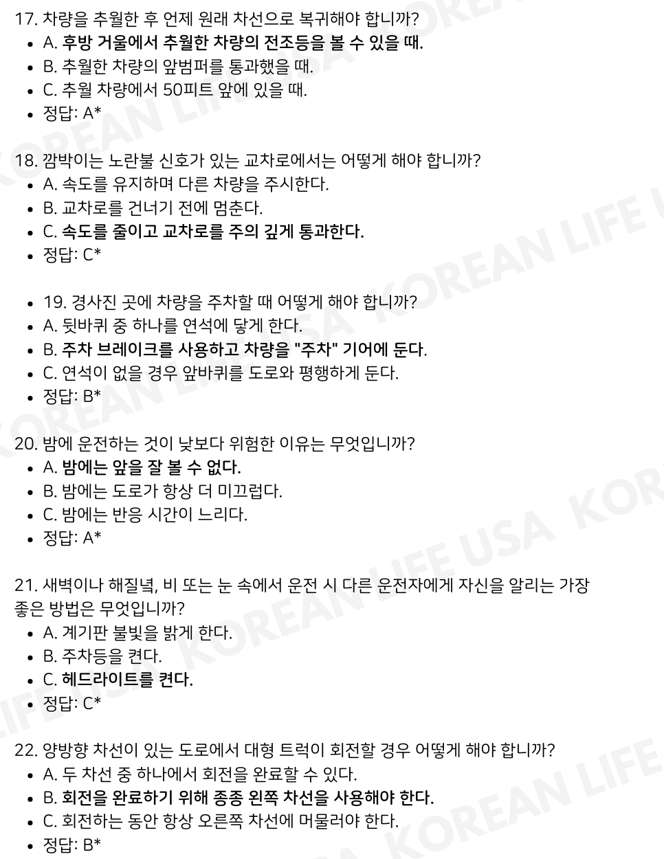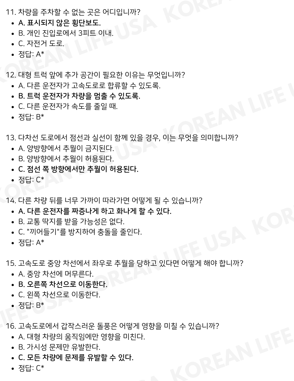 시험 문제를 정확히 이해하고 실수 없이 답변할 수 있다면 DMV 필기시험 합격은 시간문제입니다. 실수를 줄이는 연습을 통해 자신감을 키우세요. 다음 파트에서 더욱 다양한 유형의 문제로 찾아뵙겠습니다.