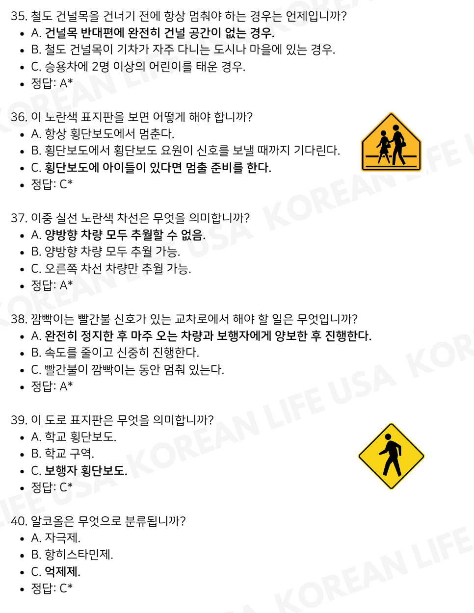 시험 준비를 하며 가장 어려운 점은 헷갈리기 쉬운 문제를 정확히 이해하는 것입니다. 이번 파트에서는 여러분이 자주 어려워하시는 도로 상황 문제와 신호 관련 문제를 정리했습니다. 시험 전 마지막 점검이라는 마음가짐으로 풀어보세요.